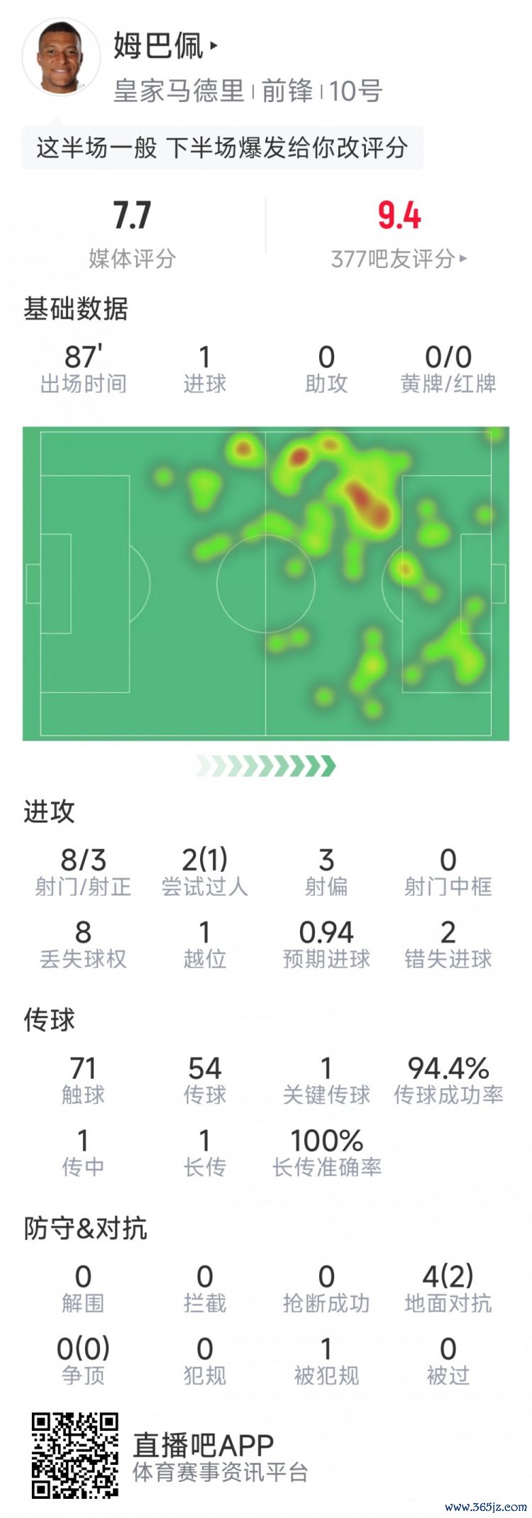 9月21日讯 在本轮西甲皇马对阵西班牙人的赛事 中,姆巴佩打进出色 世界波, AC米兰直播吧以下为他在本场数据: