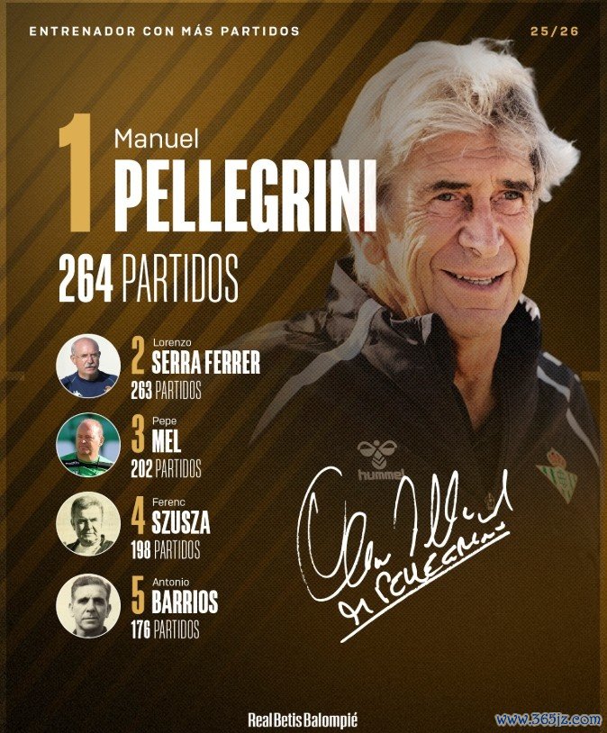 以下为贝蒂斯队史执教场次最多主指导教练员top5: