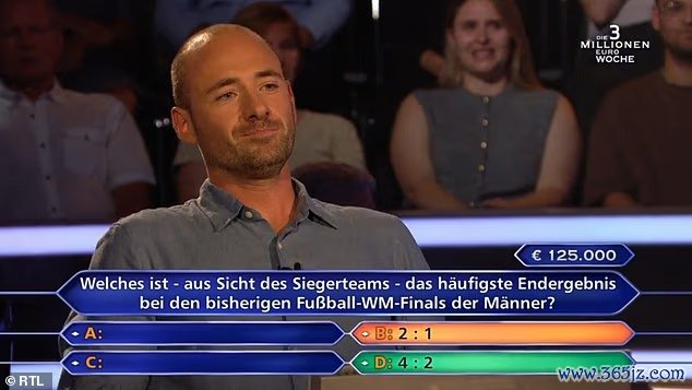 马克-奥芬巴赫尔在这档节目中一路过关斩将,将奖金积累到了可观的数额,这时主持人向他提出了新问题:“男足世界杯赛 总决赛 中,出现最多的比分是多少?1-0?2-1?3-1?还是4-2?”