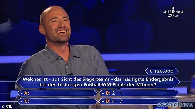 10月11日讯 在德国版的《谁想成为百万富翁》智力竞赛节目中,一位参赛者没能回答对世界杯赛 总决赛 的比分,错失12.5万欧元(约103万人民币)奖金。