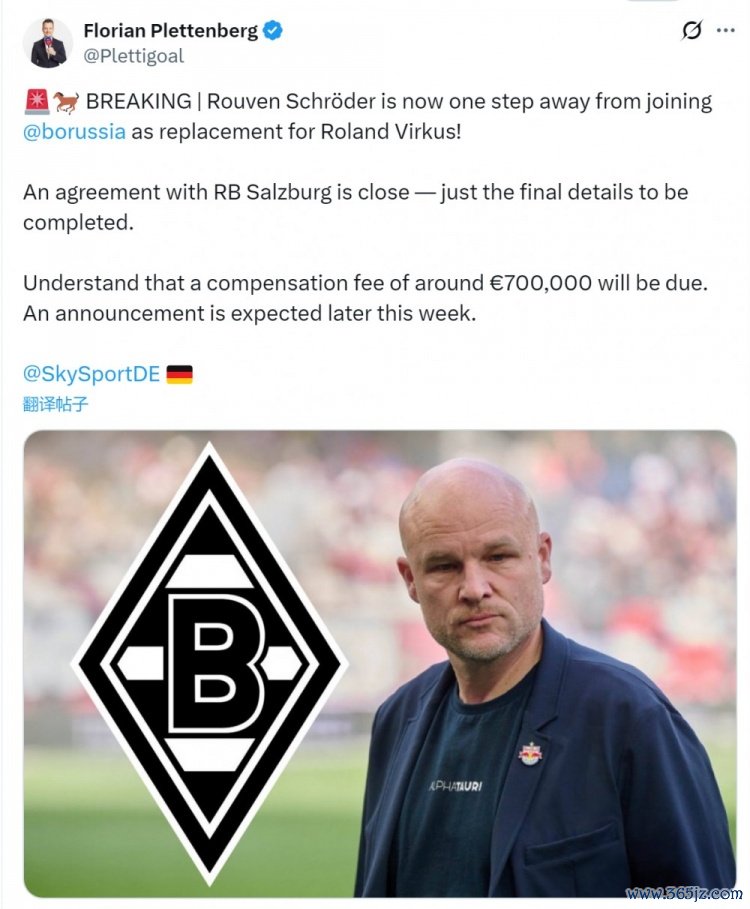 媒体指出,门兴有意聘请萨尔茨堡总监施罗德,让其成为俱乐部的新任总监,西甲新闻网以替代离任的维尔库斯, AC米兰体育直播门兴接近与萨尔茨堡达成协议, 乒乓球只剩最后细节有待敲定,补偿金约为70万欧,预计本周晚些时候官宣。
