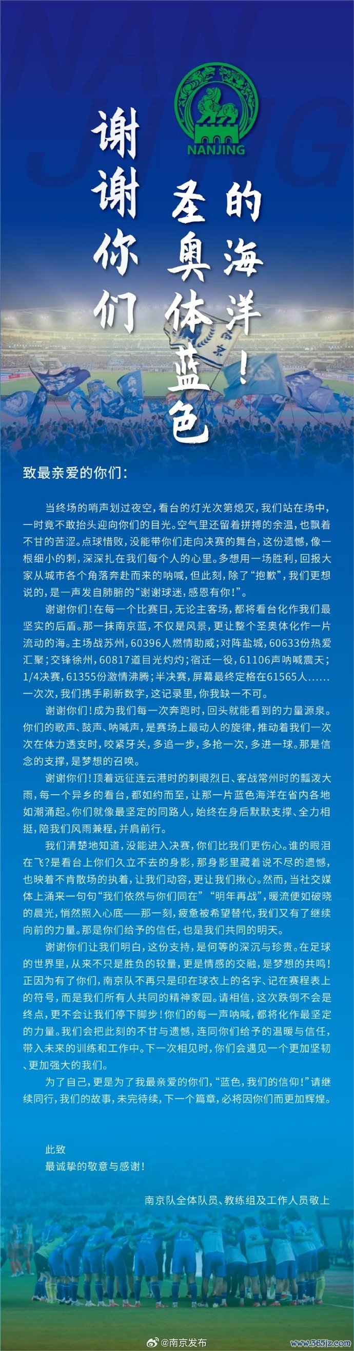 无缘苏超总决赛 ,南京队致信感谢球迷:每声呐喊都将化作坚定力量