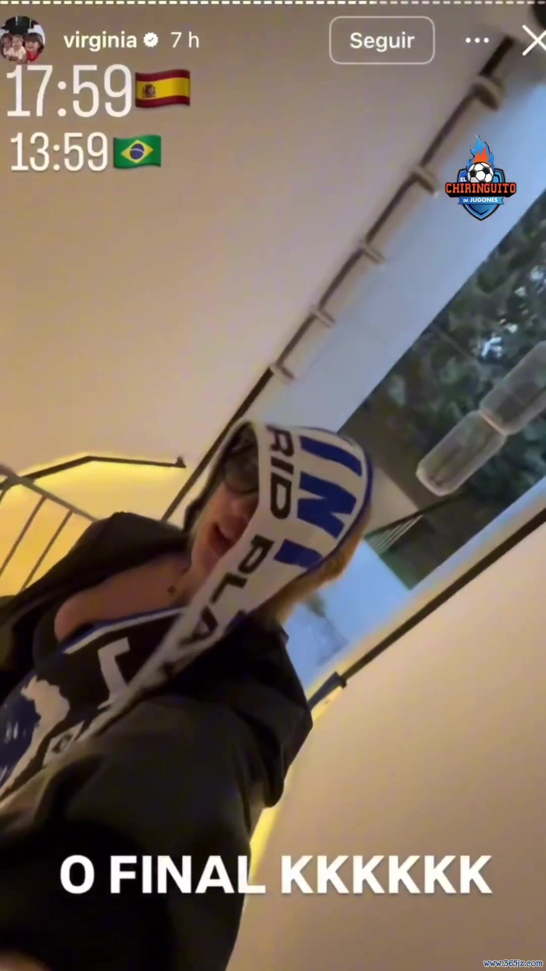 11月1日讯 维尼修斯的女友弗吉尼亚更新社媒动态,晒出头戴皇马围巾整蛊维尼修斯的视频。
