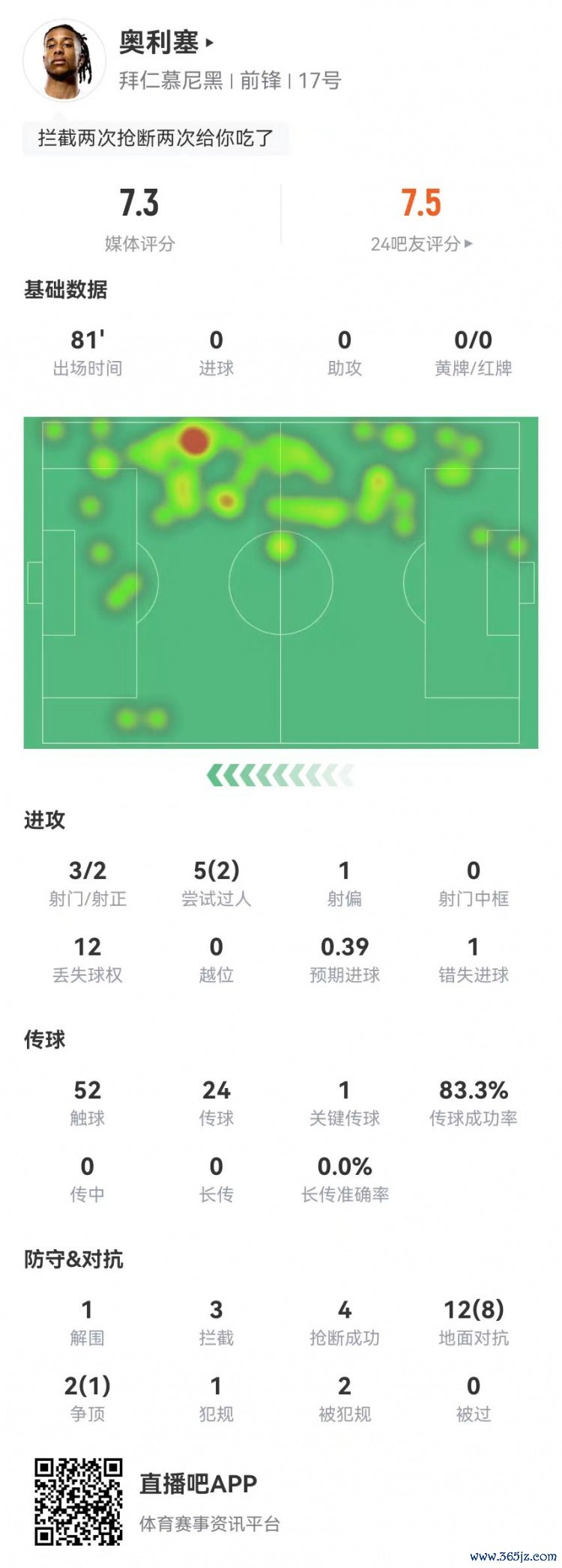 11月5日讯 拜仁在本轮欧冠焦点战2-1领跑 巴黎,奥利塞本场数据如下: