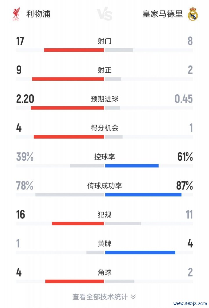 > - 利物浦1-0皇马全场数据:红军4成盘带17射9正,皇马6成盘带8射2正
