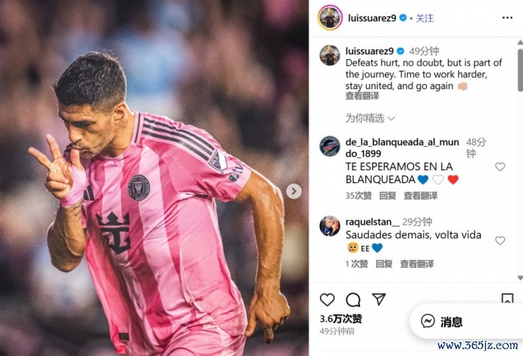 10月1日讯 美职联常规赛,迈阿密国际3-5芝加哥火焰,将争冠主动权交到了费城联合手中, AC米兰苏亚雷斯在赛后更新了社交媒体。