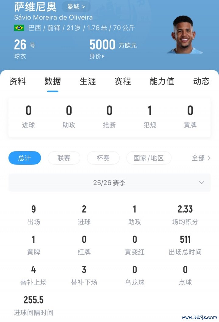 萨维尼奥现年21岁,2024年6月从赫罗纳租借回归法乙队特鲁瓦, AC米兰英超直播同年7月以2500万转会至曼城, 乒乓球目前的合同期至2029年6月。本赛季他为曼城出场9次,西甲新闻网取得2球1助。目前其德回转 价为5000万欧。