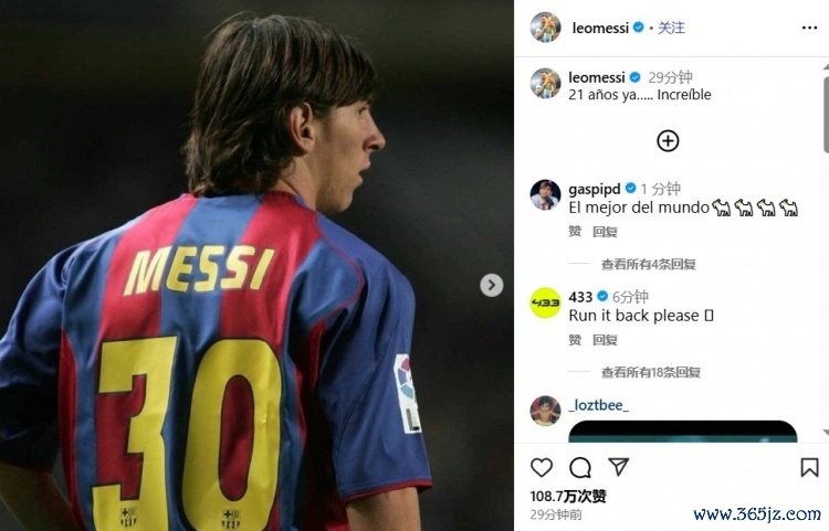 10月17日讯 梅西更新了个人社媒,纪念在巴萨一线队正式首秀21周年,发布半小时获得超过100万的赞。