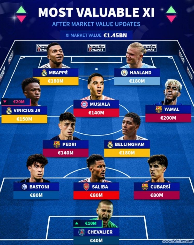 10月19日讯 德转此前更新了足坛球员身价,并盘点了目前身价最高的11人阵形 ,总身价14.5亿欧,其中亚马尔2亿欧最高,具体阵形 如下:
