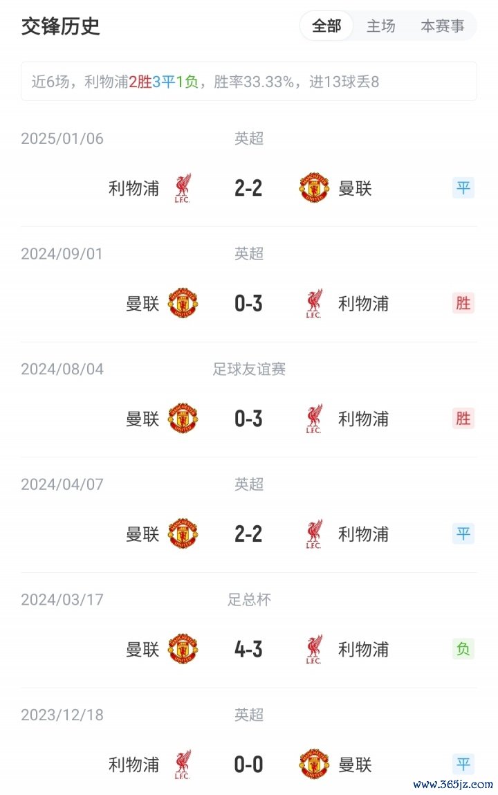 目前英超积分榜上,利物浦5胜2负积15分,位列第3;曼联3胜1平3负积10分,位列第11。