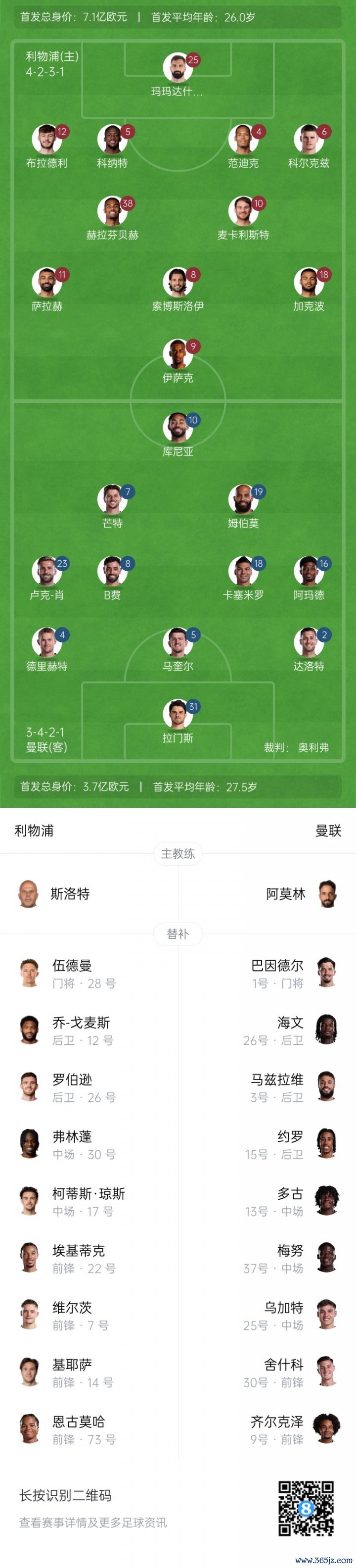 曼联杆位:31-拉门斯、2-达洛特、4-德里赫特、5-马奎尔、23-卢克-肖、16-阿玛德、8-B费、18-卡塞米罗、10-库尼亚、19-姆伯莫、7-芒特