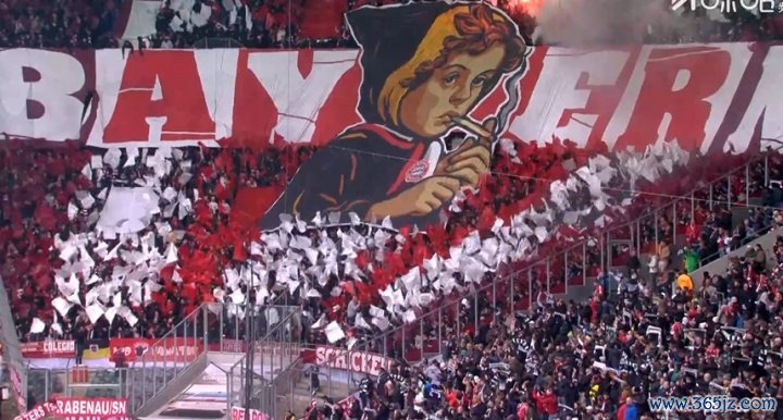 10月25日讯 今日德甲拜仁客战门兴,赛前拜仁球迷看台亮出tifo,