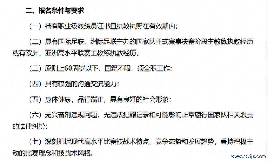 应聘者首先需要持有职业级指导教练员员证书且执教执照在有效期内;其次具有国际足联、洲际足联主办的国家队正式赛事 总决赛 阶段主指导教练员执教经历或欧洲、亚洲高水平职业联赛 主指导教练员执教经历。