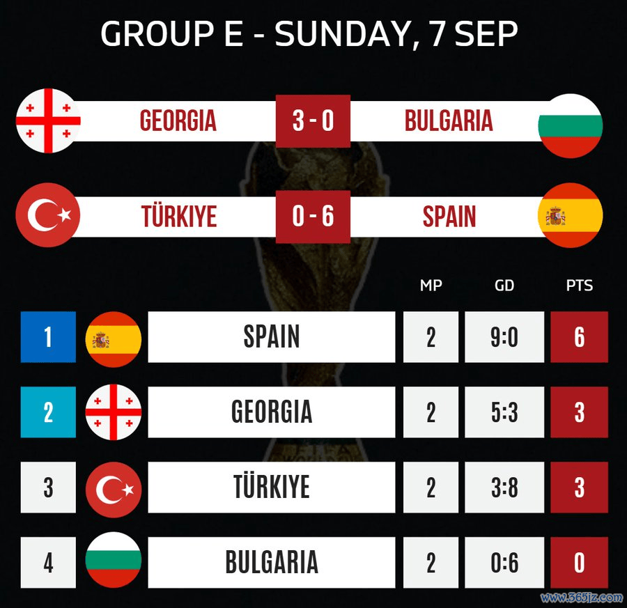 虎扑09月08日讯世界杯赛 欧洲区预选赛第一阶段小组赛第6轮首个赛事 日结束,西班牙6-0大胜土耳其,西甲新闻网直播吧比利时同样6-0哈萨克斯坦。