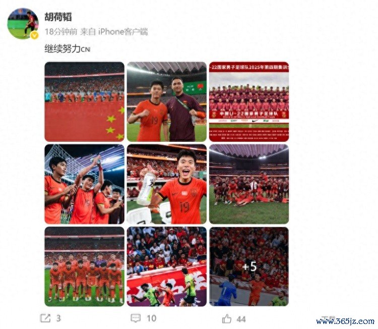 直播吧9月10日讯 U22国古代足球 员胡荷韬更新社媒,庆祝球队晋级下一轮 U23亚洲杯正式比赛。