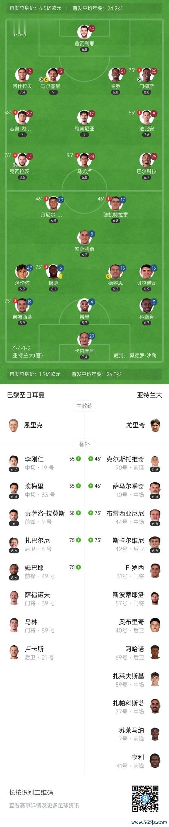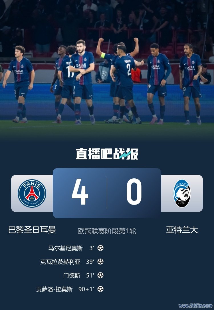 下半场补时3分钟,巴黎4-0亚特兰大。