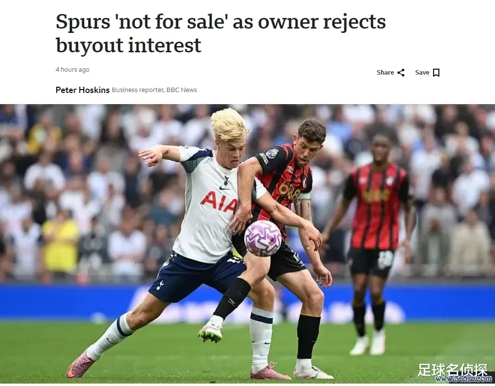 BBC消息,热刺高层表示俱乐部的所有者已经明确拒绝了两份求购报价,他们坚称这家北伦敦球会是“非卖品”。