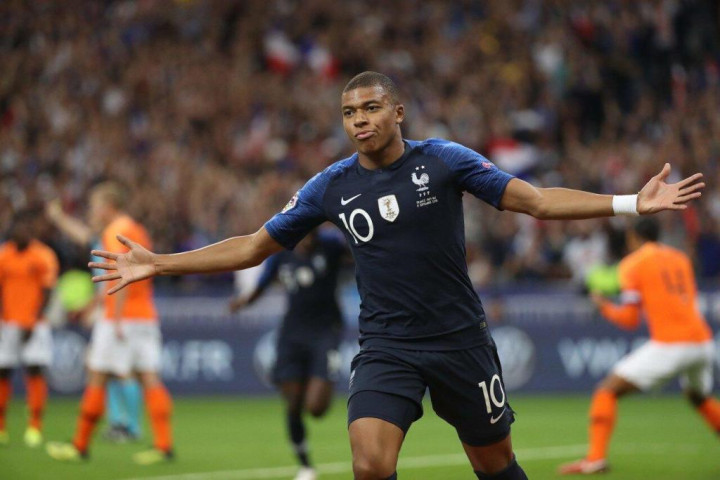 姆巴佩攻通过罚球攻入球队第三球后,举起左手臂握拳庆祝